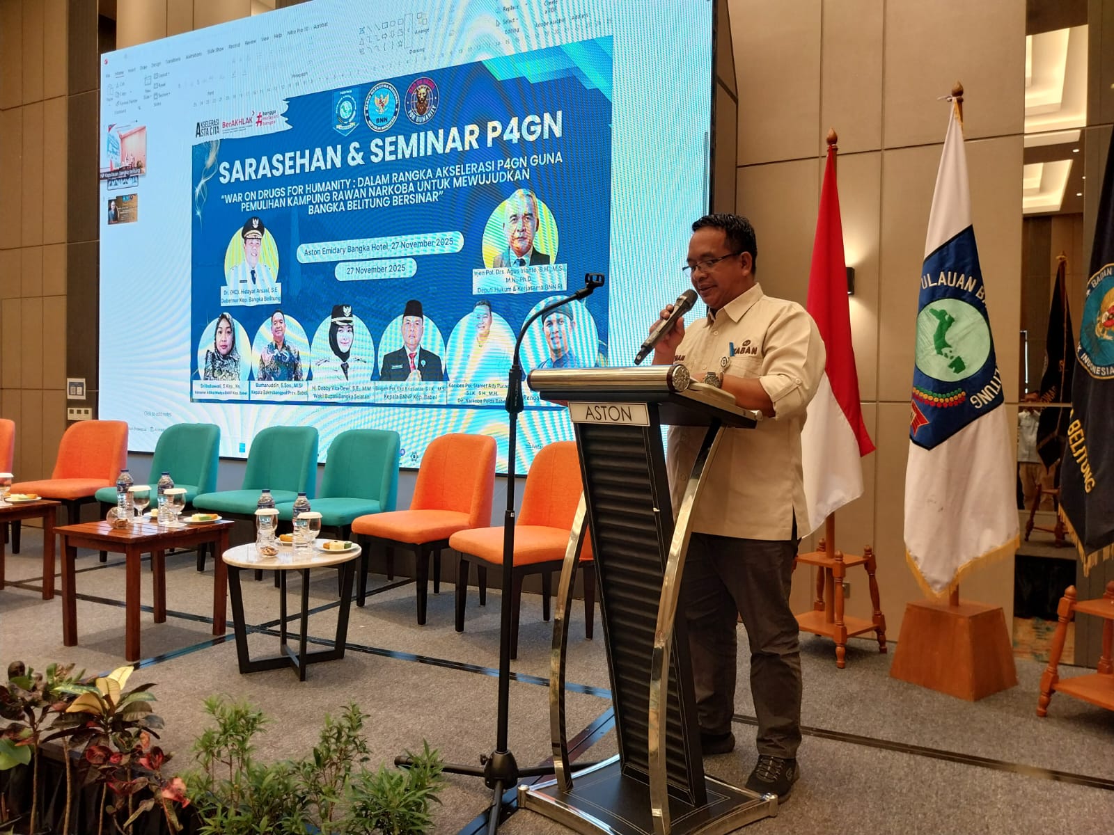 SUARAMELAYU.CO.ID, PANGKALPINANG — Pemerintah Provinsi Kepulauan Bangka Belitung (Babel) bersama Badan Narkotika Nasional Provinsi (BNNP) Babel menggelar Sarasehan dan Seminar Pencegahan, Pemberantasan, Penyalahgunaan dan Peredaran Gelap Narkotika (P4GN) bertema “War on Drugs for Humanity”, Kamis (27/11/2025) di Aston Emidary Bangka Hotel & Conference Center.
