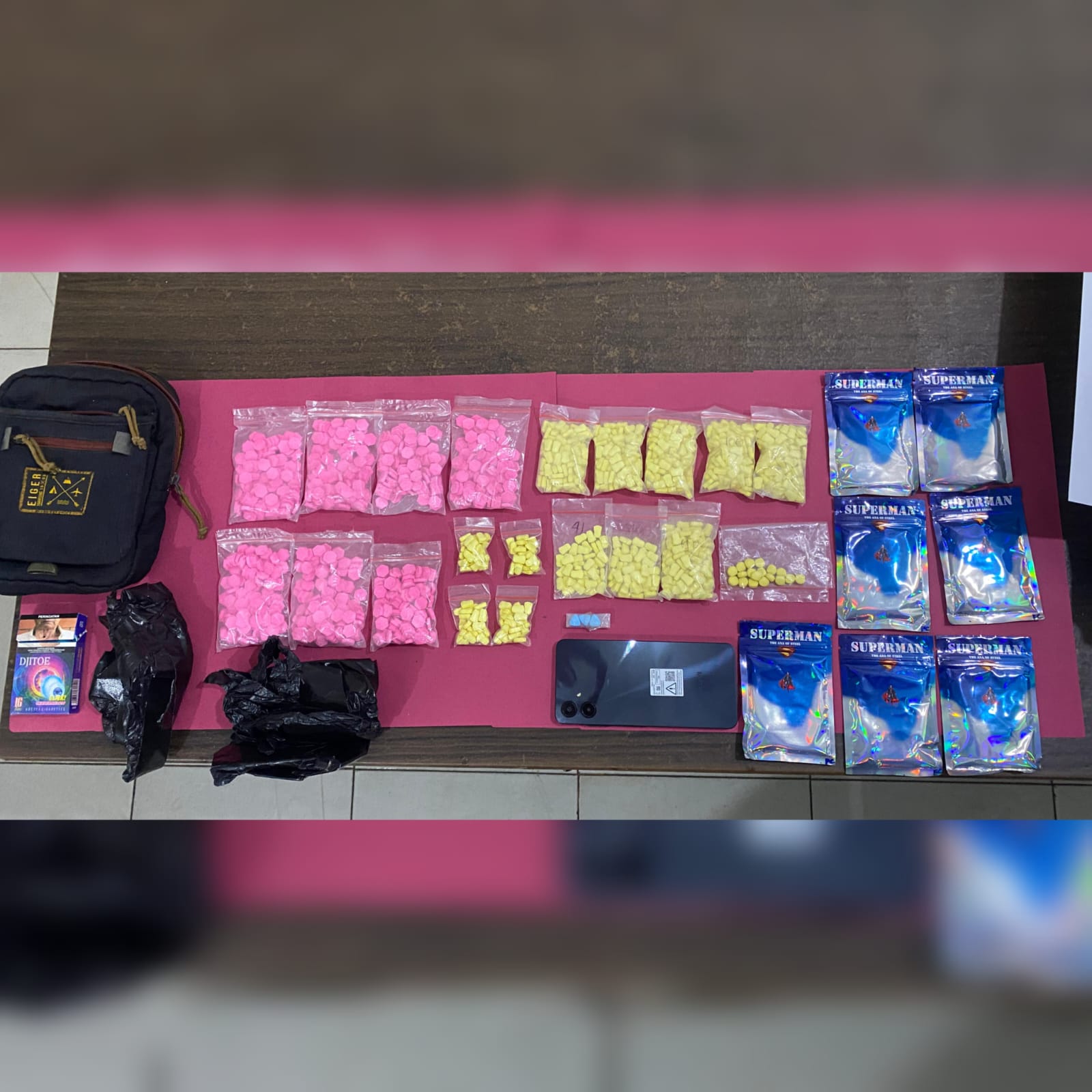 “Ada juga disita dari pelaku yakni 7 bungkus narkoba jenis happy water merk superman warna biru hitam,”sambungnya.
