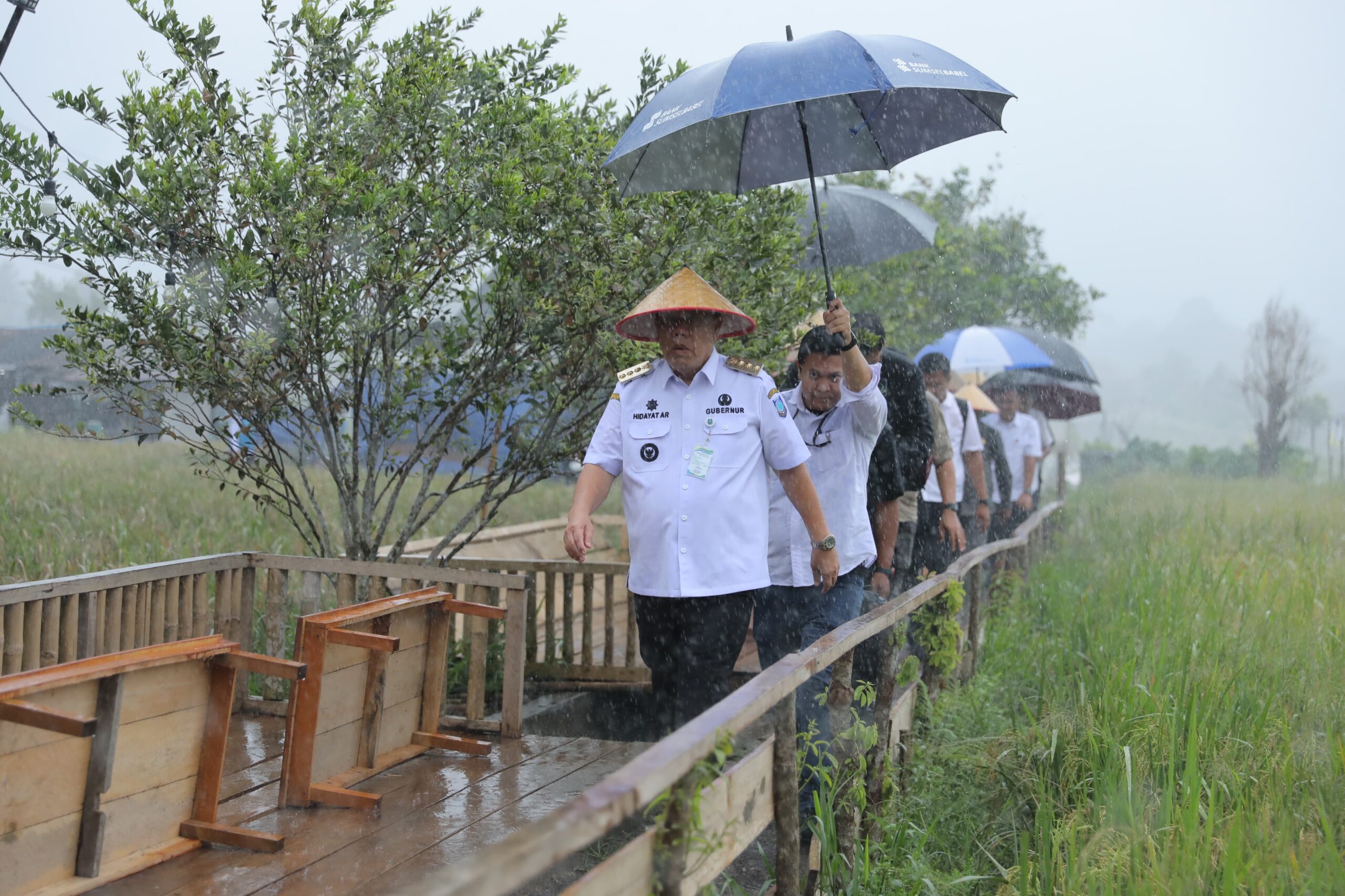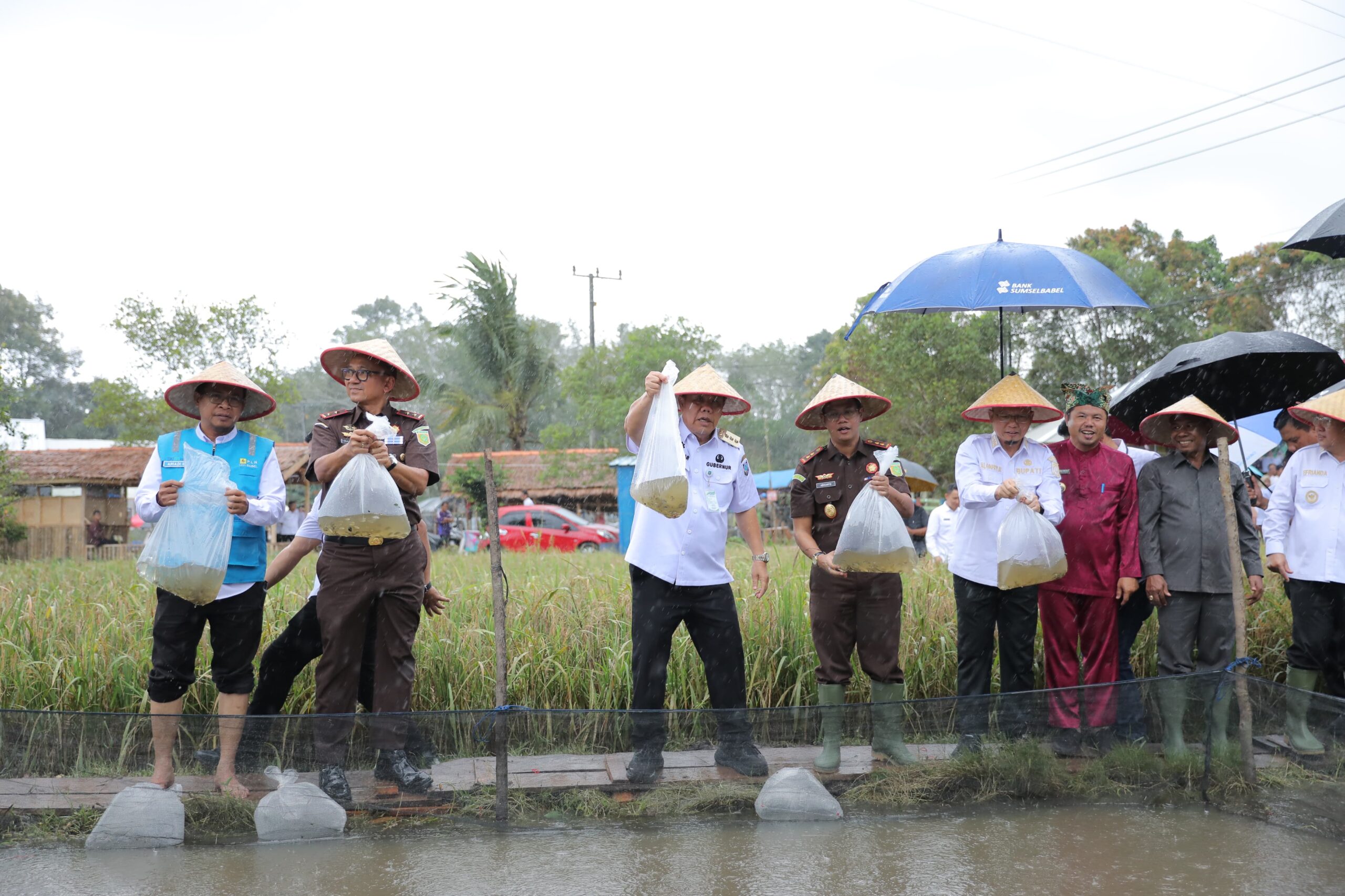 Di tengah guyuran hujan lebat, Gubernur Hidayat tetap mengikuti seluruh rangkaian kegiatan, mulai dari panen raya, murok jerami, hingga penebaran benih ikan bersama Bupati dan Wakil Bupati Bangka Tengah serta unsur Forkopimda. Kehadirannya menjadi simbol komitmen kuat pemerintah daerah dalam mendukung program strategis lintas sektor.