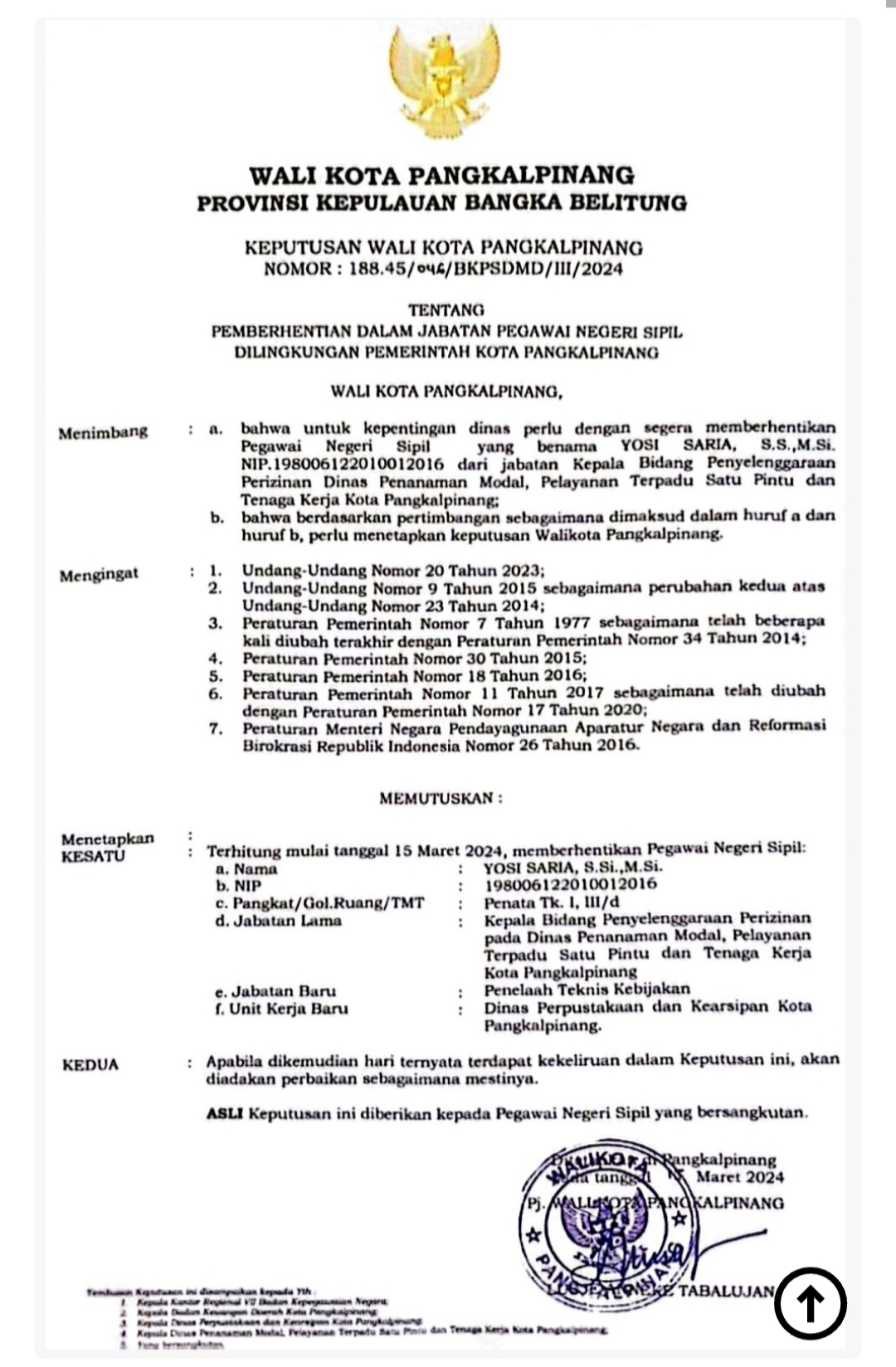 Dalam SK yang beredar tersebut, Pj, Walikota Pangkalpinang menandatangani SK yang memutuskan dan menetapkan, Terhitung mulai Tanggal 15 Maret 2024 Pemerintah Kota Pangkalpinang resmi memberhentikan Pegawai Negeri Sipil Atas Nama Yosi Saria S.Si,.M.Si. dengan Nomor Induk Pegawai (NIP) 198006122010012016 yang sebelumnya menjabat sebagai Kepala Bidang (Kabid) Penyelenggaraan Perizinan pada Dinas Penanaman Modal, Pelayanan Terpadu Satu Pintu (DPMPTSP) dan Tenaga Kerja Kota Pangkalpinang yang kini di Non jobkan ke unit kerja baru Dinas Perpustakaan dan Kearsipan Pemerintah Kota Pangkalpinang dengan Jabatan baru sebagai Penelaah Teknis Kebijakan.
